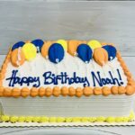 Perfect for almost any birthday. This cake features buttercream icing with piped balloons and streamers and can be customized in any size and color palette.