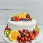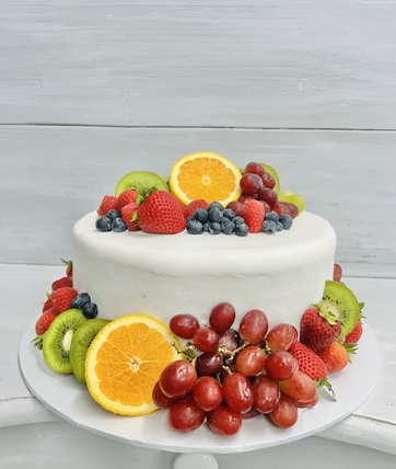 A perfect blend of cake and icing. This cake features fresh fruit and flowers and is a wonderful addition to a simple dinner party or minimalist event.