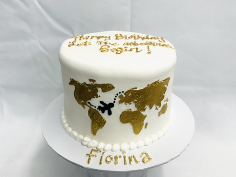 Smooth buttercream with a hand-painted gold world map. We’ve made this cake for graduations and birthdays and can be customized for your event too!