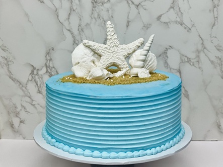 Add a touch of coastal chic to your next event. This cake features knifed buttercream and fondant seashells.