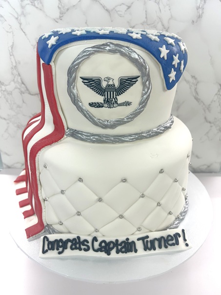 Smooth buttercream, quilted fondant, a military emblem, and a proudly made American Flag create a cake that you and your guests will remember long after your event. This cake has been made for military services as well as family events.