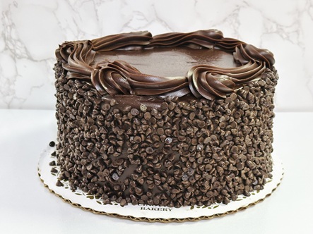 4 Split Layers of a Cinotti’s original Sawgrass Cake (dense chocolate cake with a hit of cinnamon) iced in rich chocolate icing, covered in chocolate chips.
