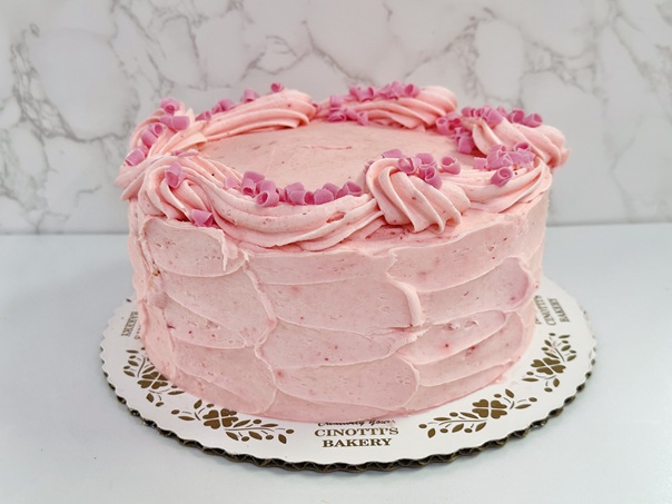 4 layers of our strawberry cake with strawberry filling iced in our hand-mixed strawberry buttercream then garnished with pink curls.