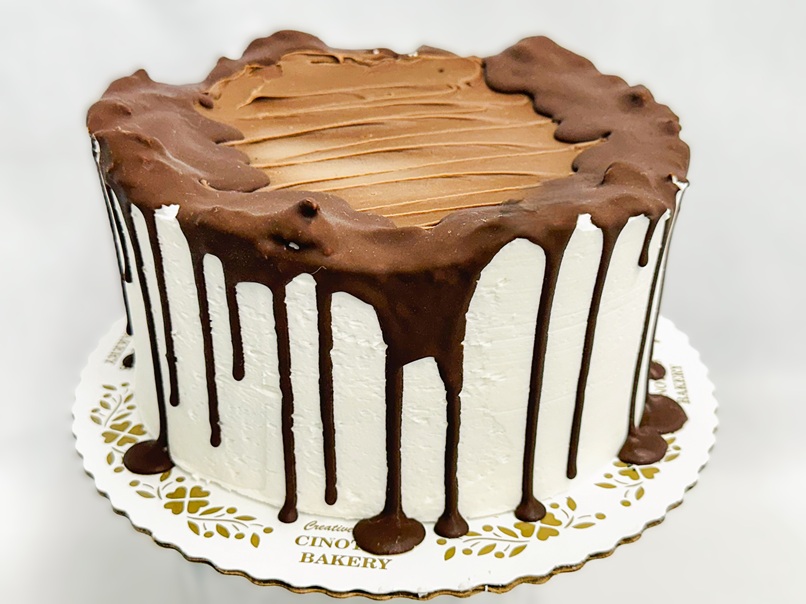 Homemade Peanut Butter Buttercream generously spread between 4 layers of our chocolate cake. Iced in Peanut Butter Buttercream then drizzled with warm chocolate ganache and topped with bits of peanut butter candies.